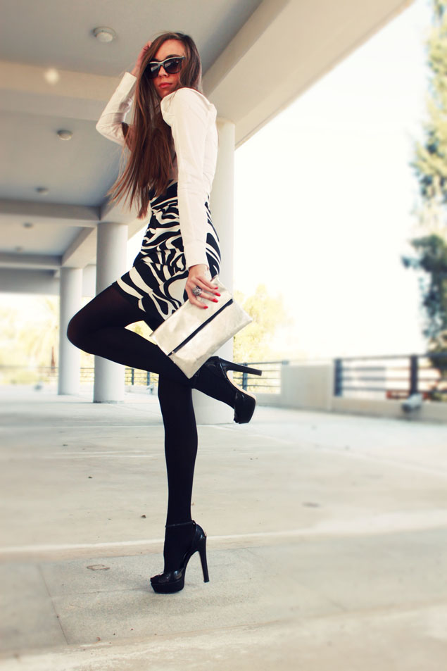 Белая рубашка, юбка и лаковые туфли - классическое сочетание до боли знакомое всем офисным работникам.  Во избежание заезженности сегодня я выбрала юбку c принтом зебры, моего любимого фасона- тюльпан.  За счет юбки образ сразу трансформировался из офисного в совершенно противоположный  вариант. В таком виде я бы смело пошла на премьеру или даже на коктейльную вечеринку, да мало ли куда еще.  Конечно, не малую роль сыграли аксессуары,  клатч из металлизированной кожи, массивное украшение и очки с цепочками (подарок моей Маши, как же она любит меня порадовать).